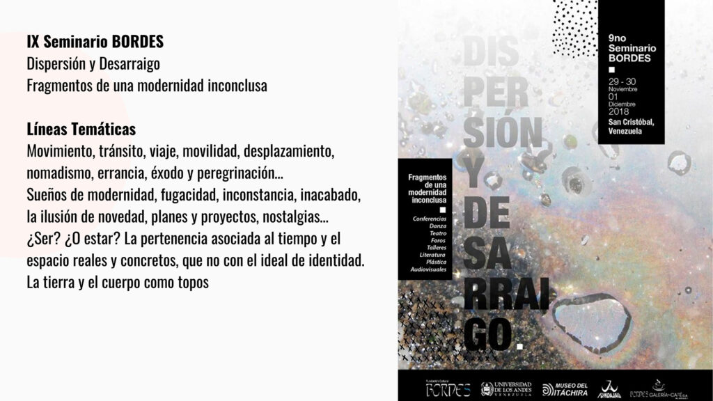 Del 28 de noviembre al 1 de diciembre de 2018, llegó la novena edición del seminario transdisciplinario Bordes, la cita anual para compartir el trabajo de investigación y reflexiones desde distintos discursos, disciplinas y oficios. El Seminario arribó a su novena edición, dedicada al tema DISPERSIÓN Y DESARRAIGO. Fragmentos de una modernidad inconclusa.