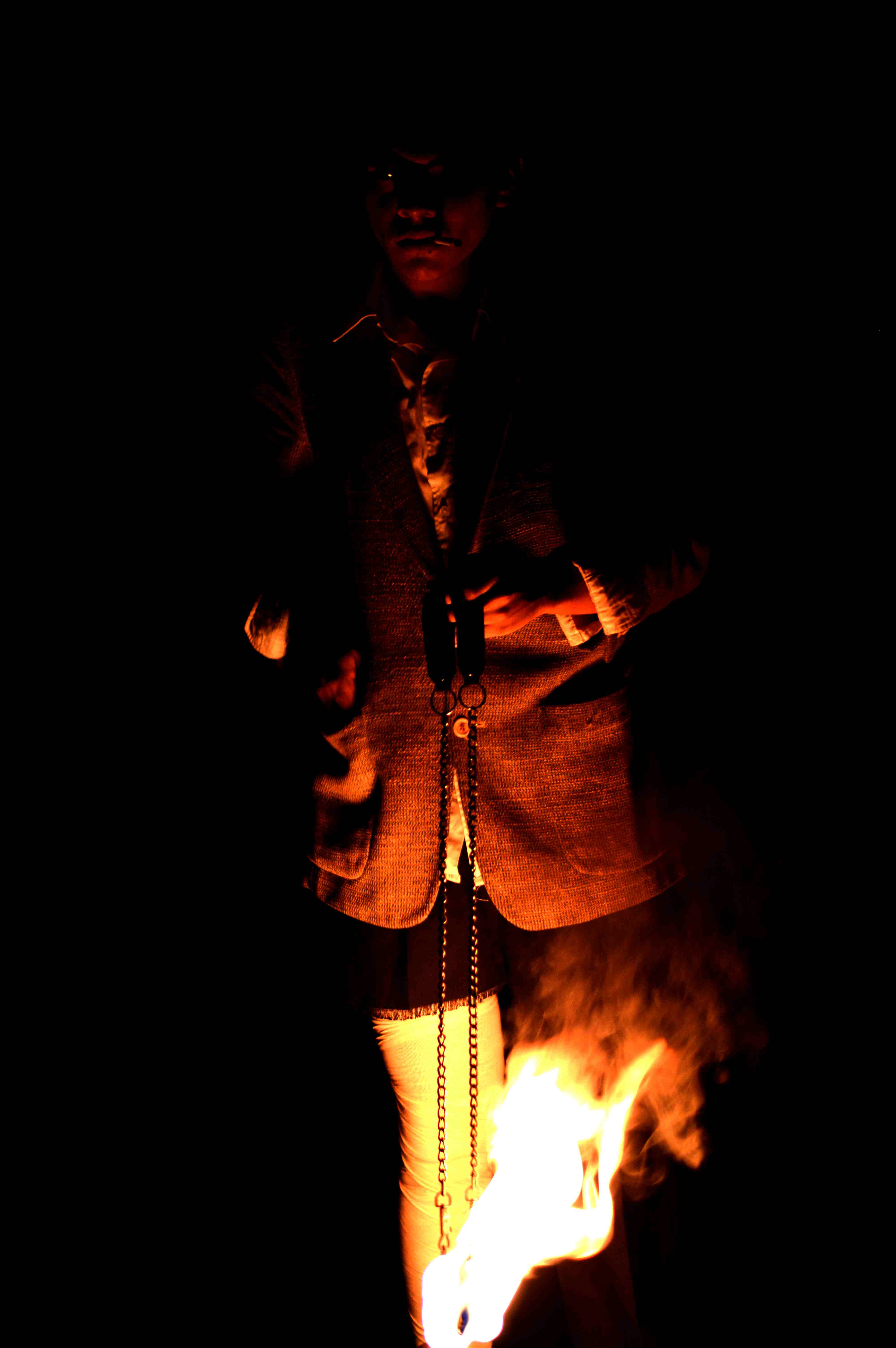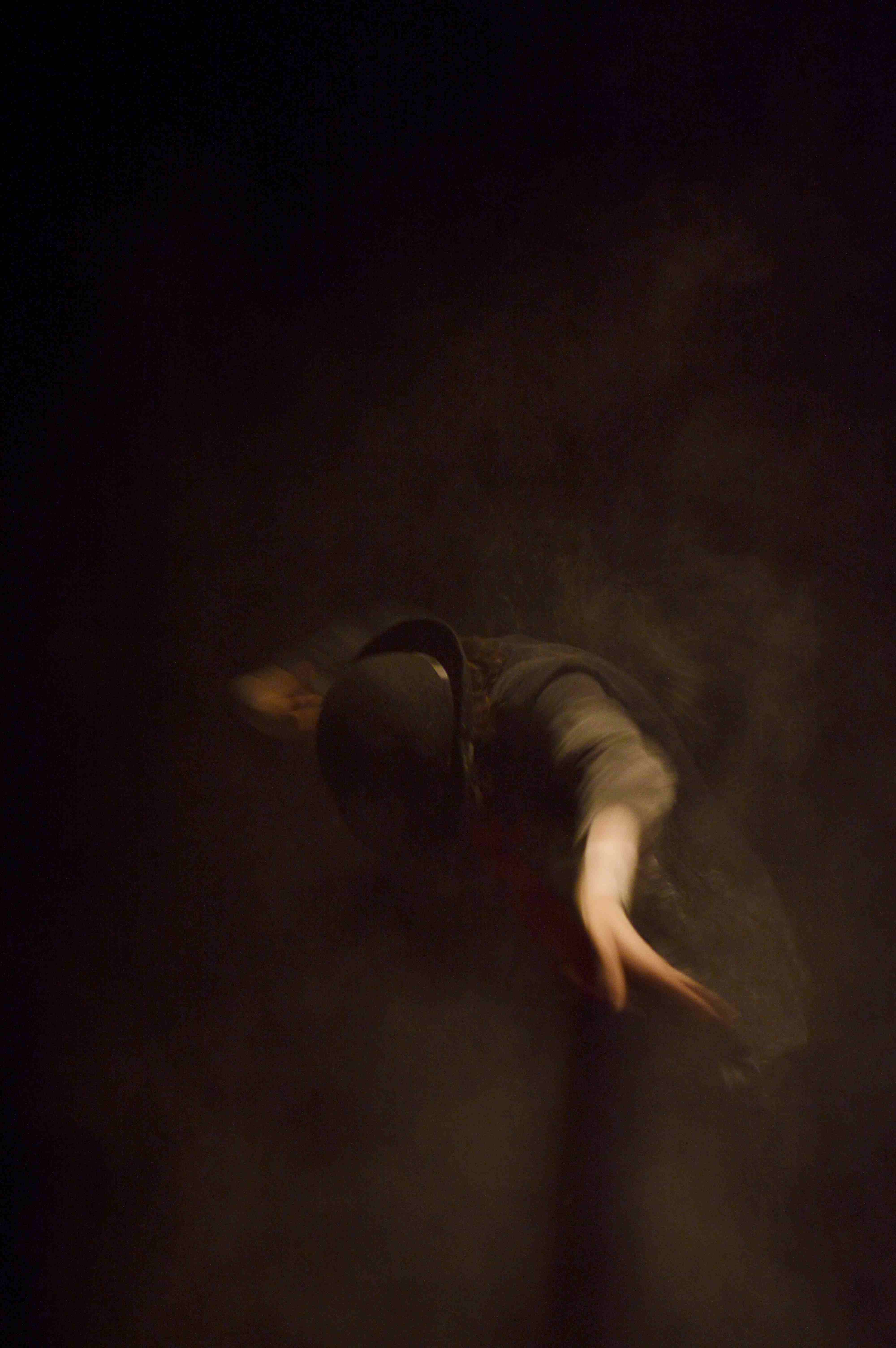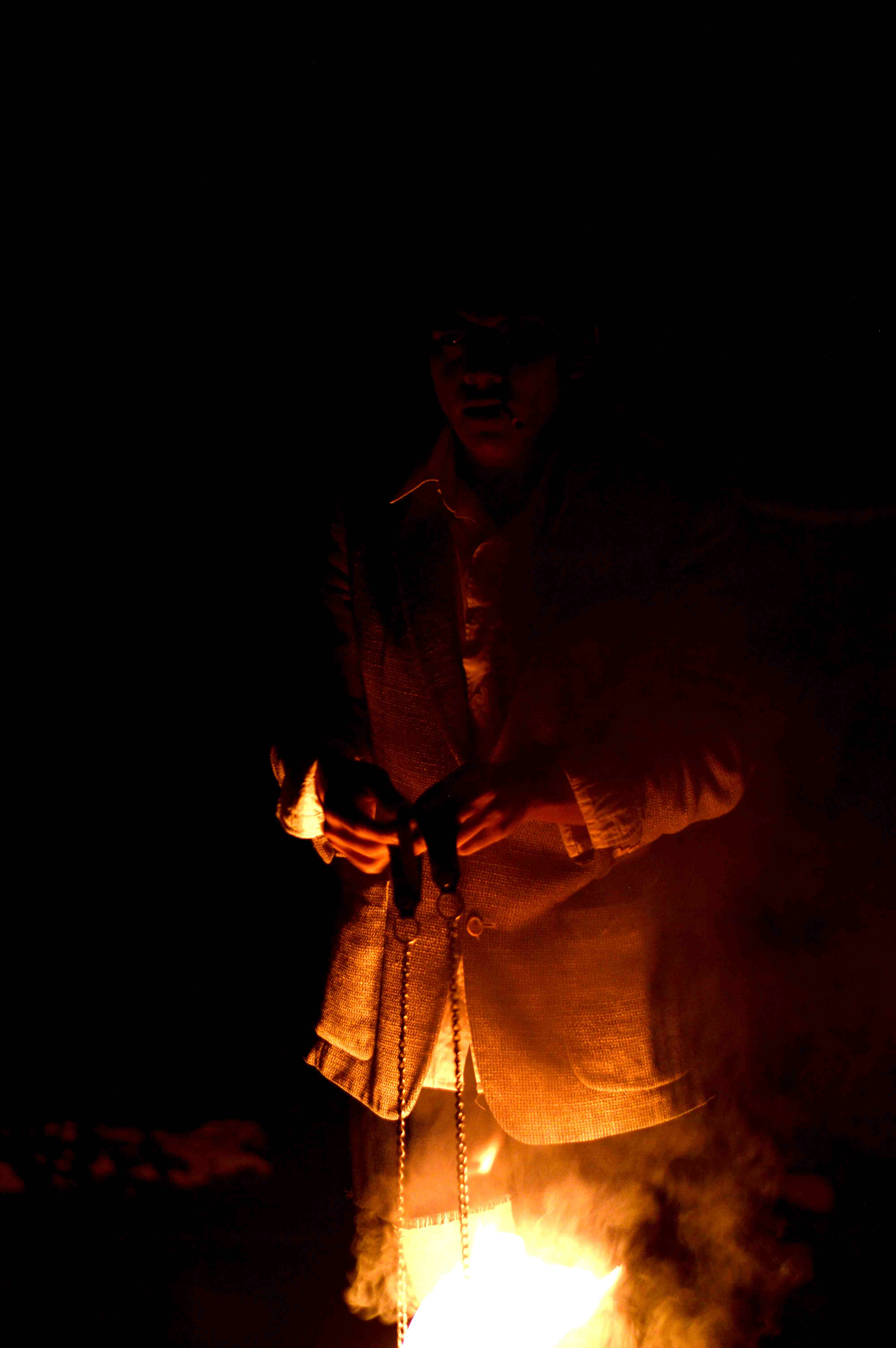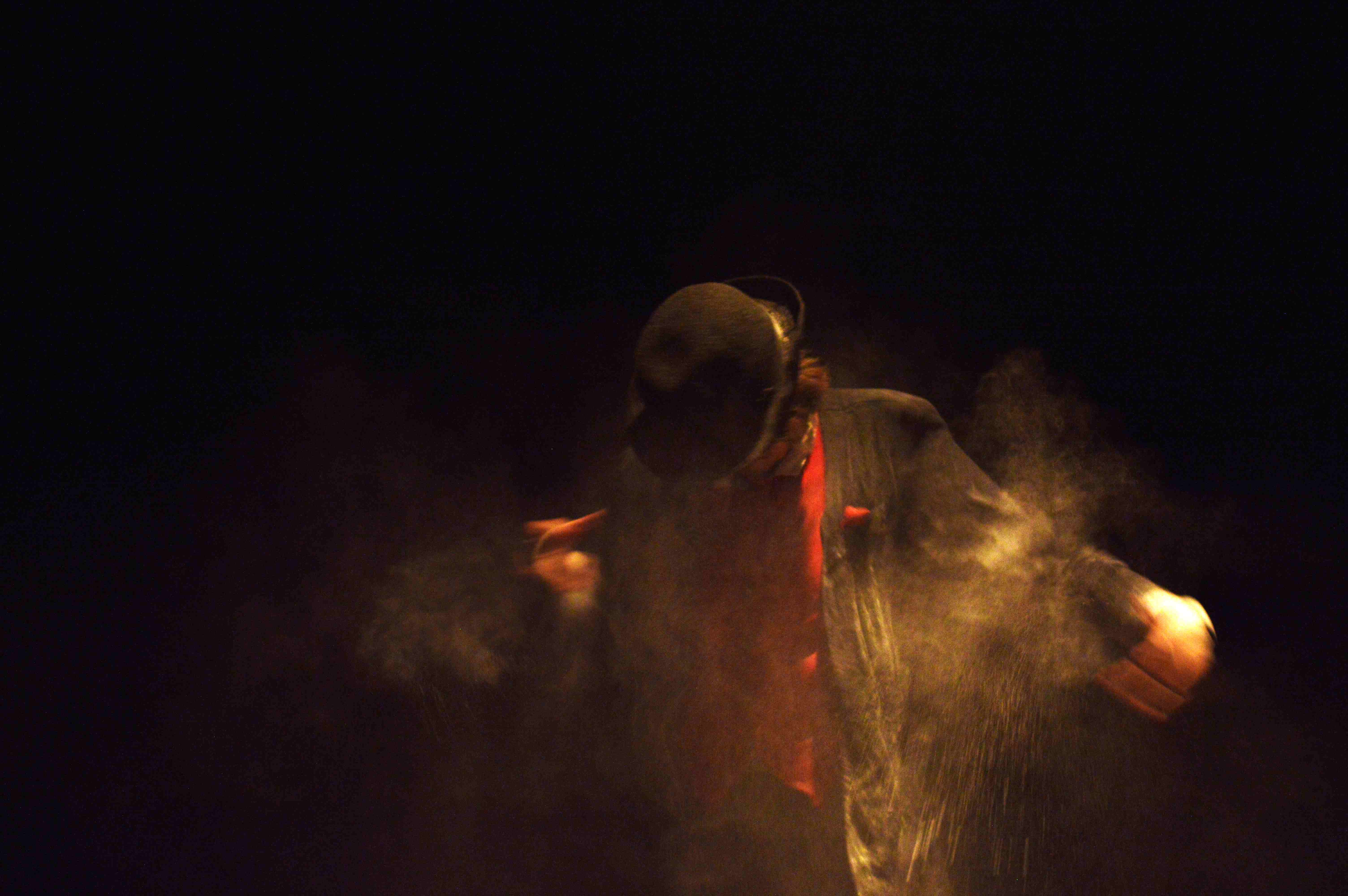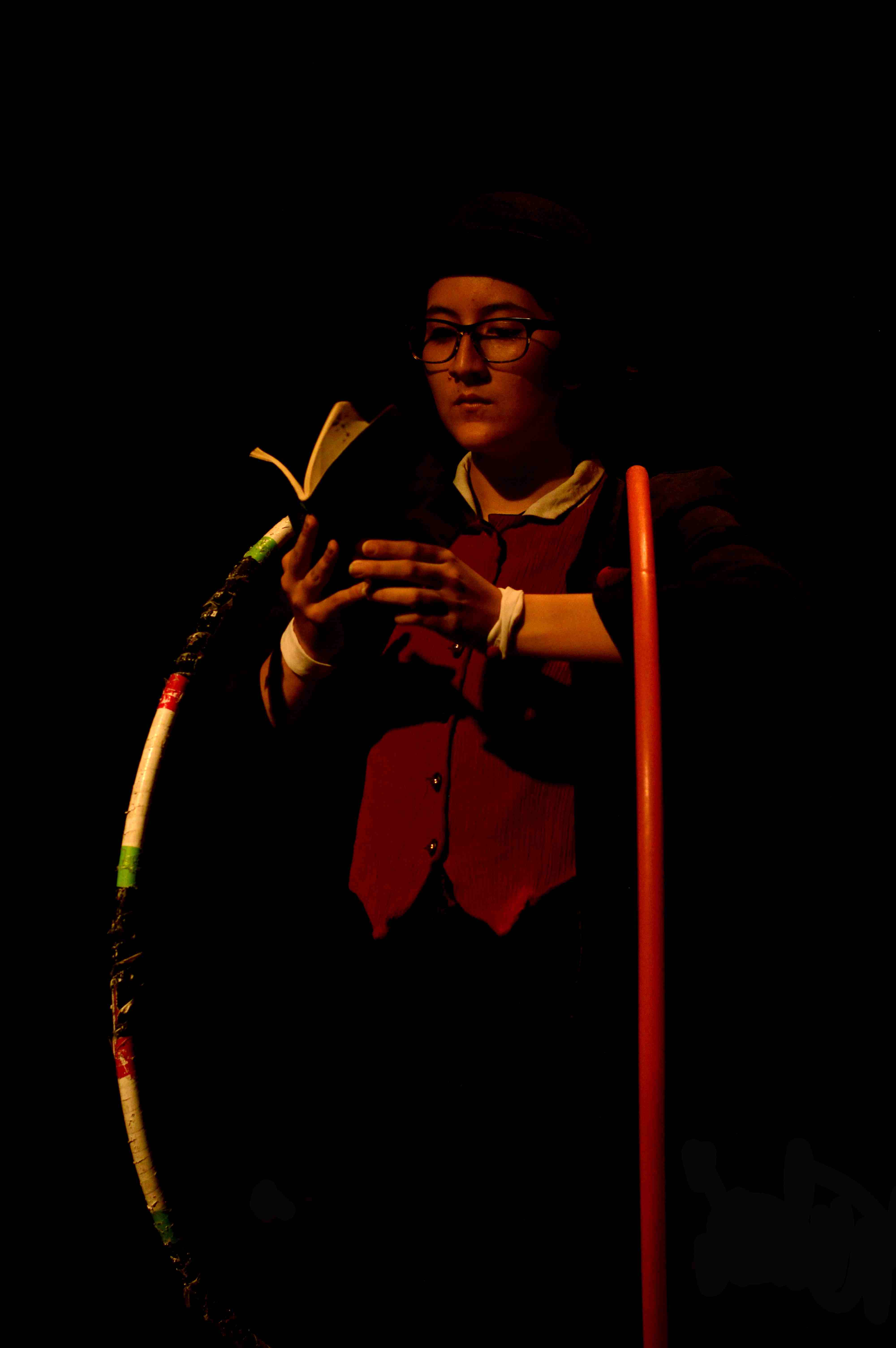 La imagen del violinista, una especie de fauno, ángel y demonio, es muy poderosa dentro de la puesta en escena, aunque eso no desmerece otras, como la bailarina, el militar y el tuerto malabarista que espera en vano mientras nos hipnotiza con sus juegos piromaníacos. Pero son difíciles de recordar, a pesar de la gran fuerza que cada intérprete imprime al trabajo, pues más que personajes definidos son espectros corporizados. El lector de los cuentos (Adela Sánchez Lagos) es el eje que conecta los distintos cuadros narrativos. (Aunque, distanciándose de Garmendia, Omar sigue la escuela del Incinerador y traza cuadros plásticos en lugar de contar historias). Probando en distintas funciones el narrar con lentes, sin lentes, leyendo, recitando de memoria, a capela, con micrófono…. En todas, el personaje resulta encantador, por lo que sugiere de fantástico e infantil, con sus lentes y su sombrero antiguo. Sólo echamos de menos un mayor disfrute de esta lectura, un ritmo más lúdico en la entonación (el teatro es audiovisual, y el exceso de trabajo visual va en detrimento de la poética auditiva). Además, los amantes de la literatura nos quedamos con las ganas de escuchar un poco más de los cuentos, pues apenas unas líneas sirven de detonante para dibujar escenas fantásticas con los cuerpos de los actores.