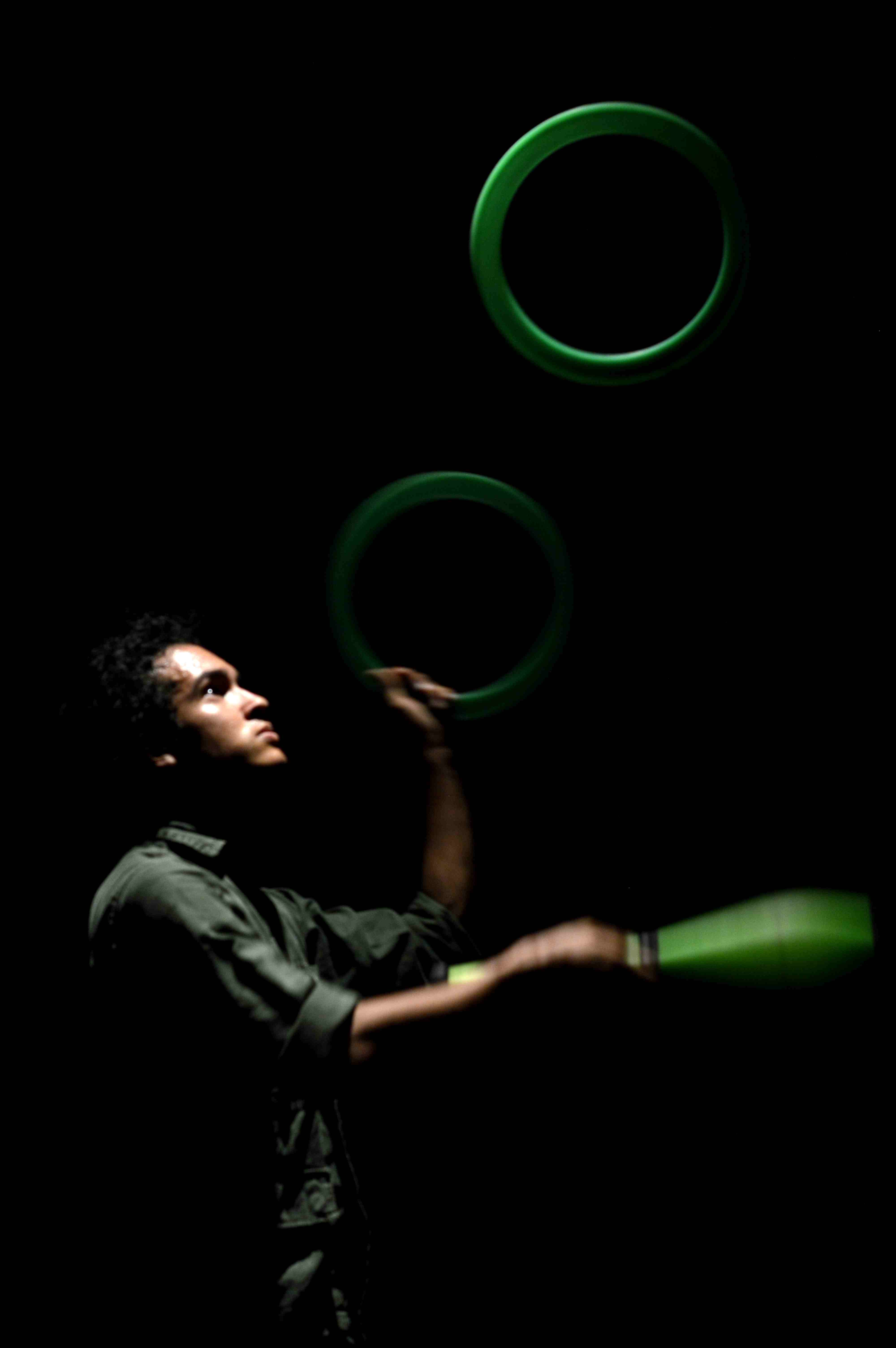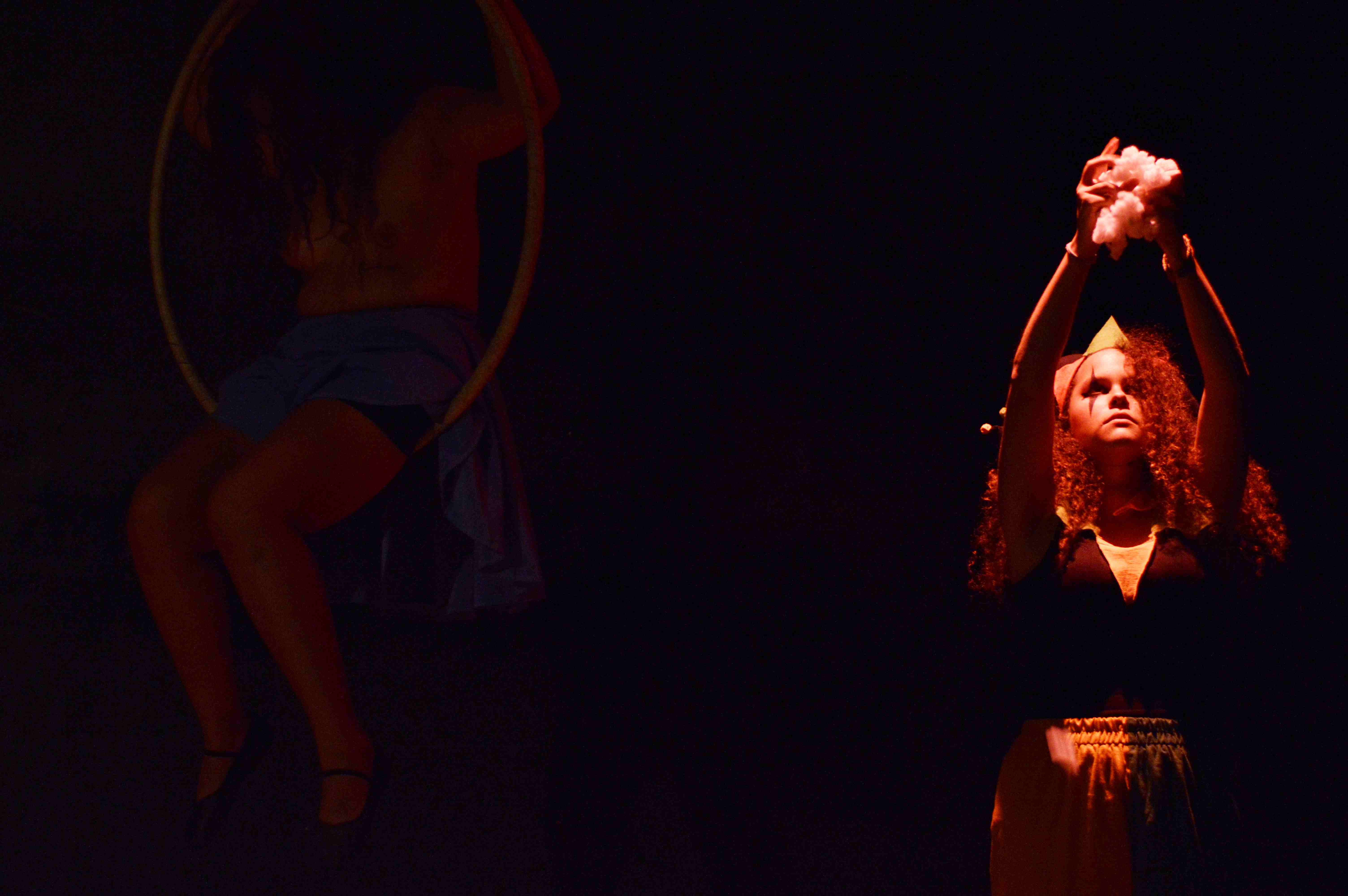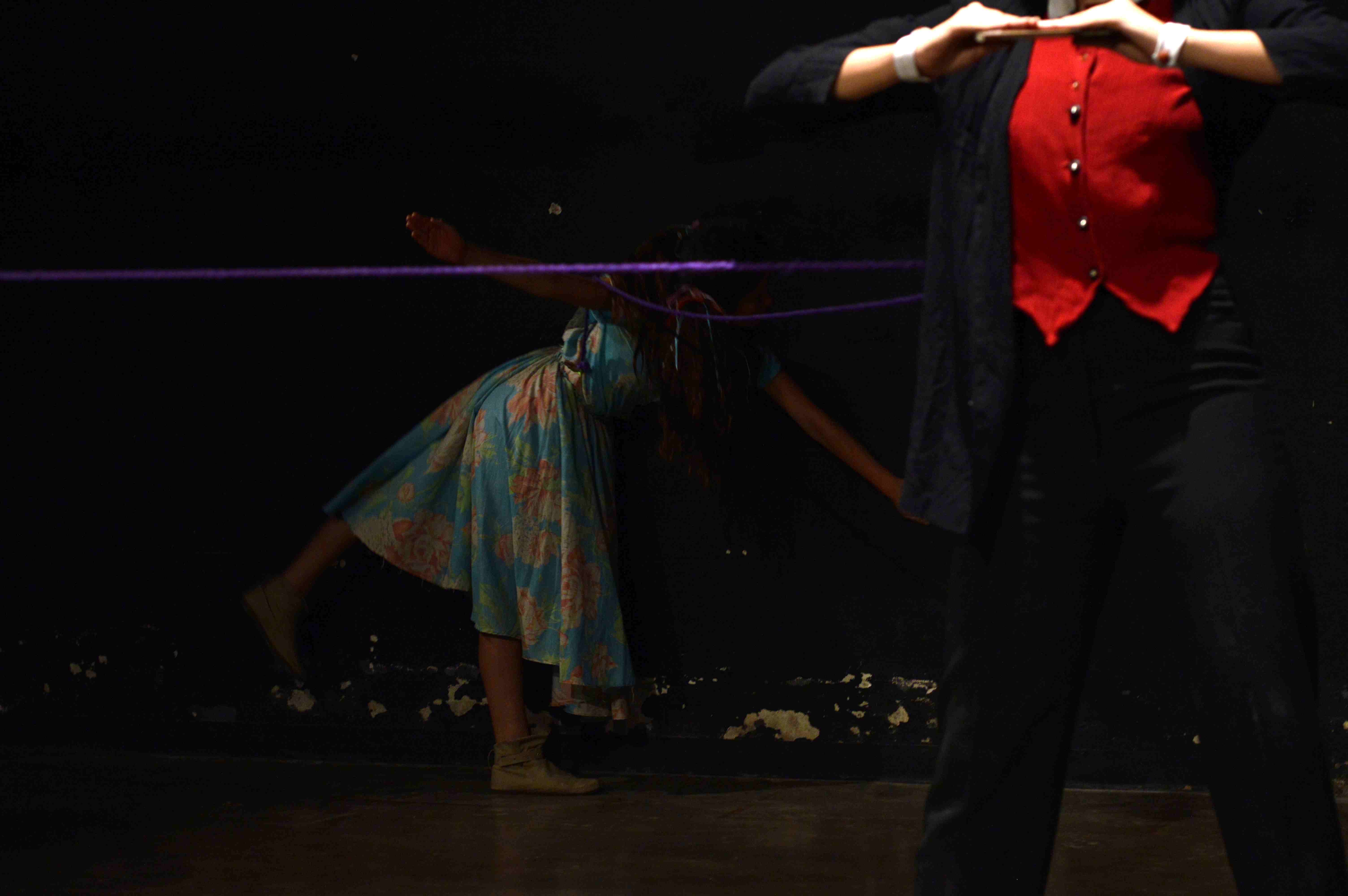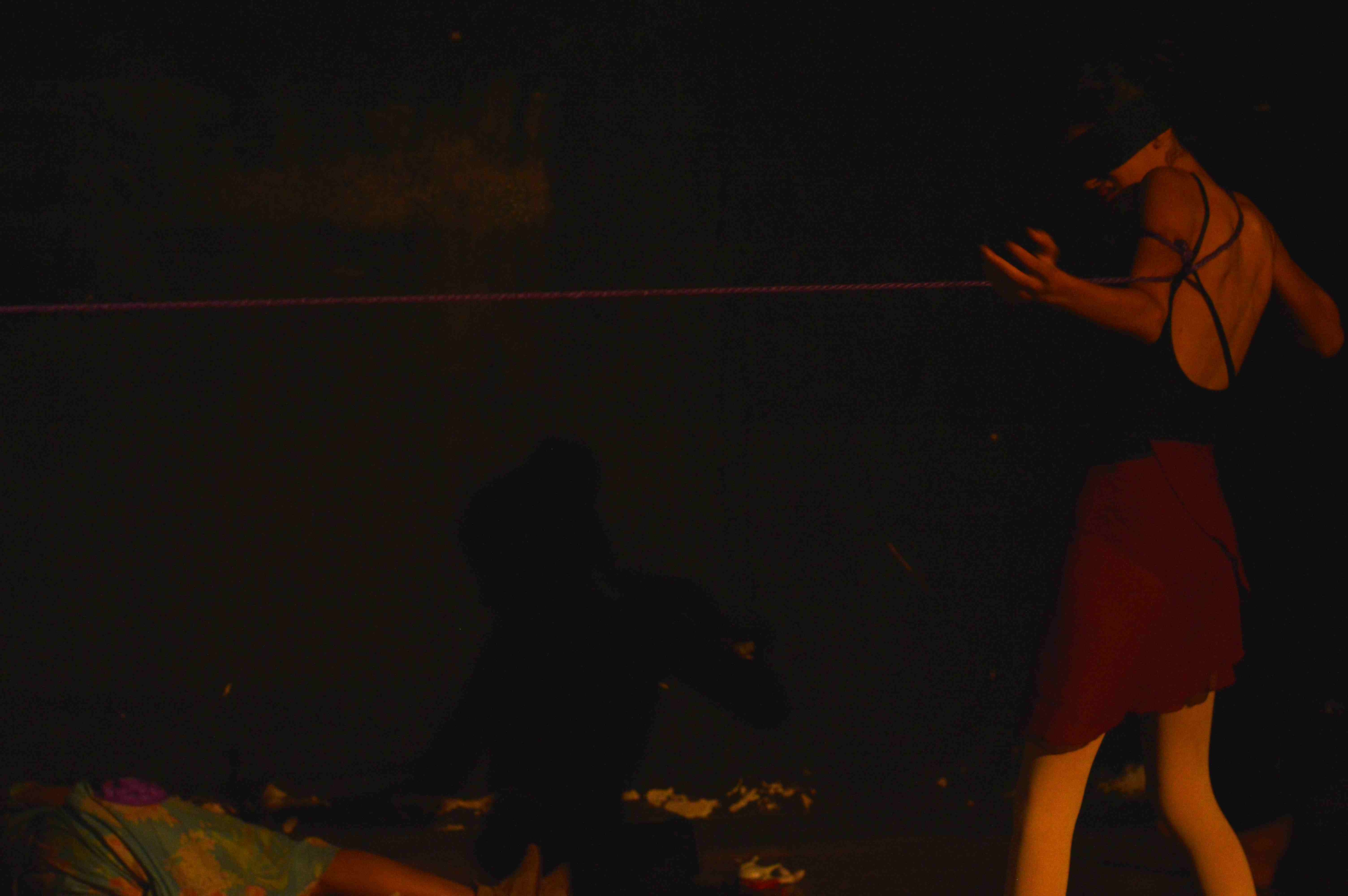 El manejo del color y las formas corporales es fundamental en este montaje, que cuenta con la particularidad de incluir artistas del circo más que actores. Quizá por esta circunstancia, o quizá porque en el uso del espacio se advierte que nos encontramos con otra mano en la dirección, es la primera vez que veo una obra de este grupo que no parece diseñada para la Sala Rafael Daboin de la UNET. A pesar de encontrar imágenes repetidas, que conocemos de otros montajes, pues el discípulo sigue un estilo muy marcado. Cuerpos amarrados, enfrentados, tensión, sensualidad, la figura femenina pasiva, cosificada; una dispersión de objetos por el suelo que dan la sensación de suciedad… La estética es fácilmente reconocible. Sin embargo, hay algo de exceso de movimiento, fuerza, o de tamaño quizá? Los cuadros se desbordan del espacio permitido y generan un deseo de verlos desde más lejos, a mayor altura. Hay algo que encontramos desproporcionado. Y es incómodo, pero interesante.