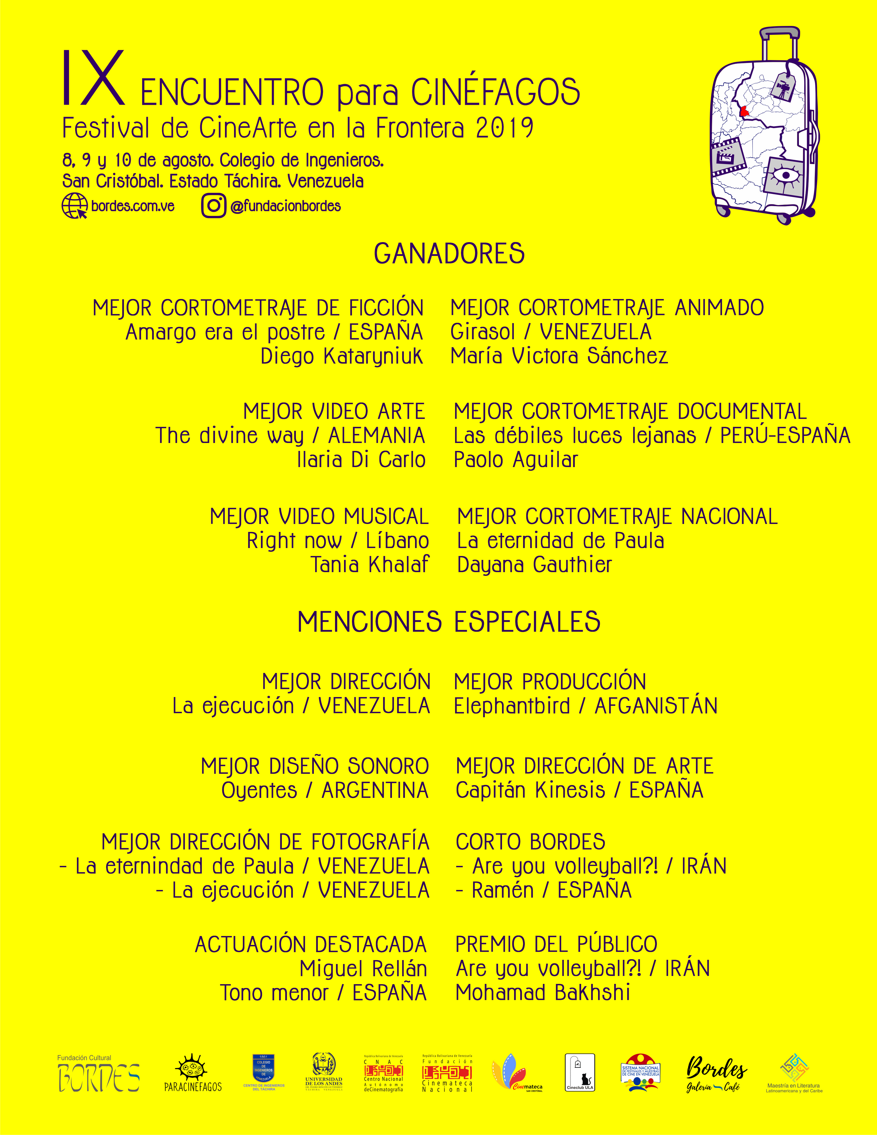 La novena edición del Encuentro para Cinéfagos, festival internacional realizado ininterrumpidamente desde 2011 en San Cristóbal, Venezuela, concluyó felizmente la noche de ayer sábado 10 de agosto, después del anuncio del veredicto emitido por el jurado invitado, conformado por Rafael Marquina (Docente de la Facultad de Artes de ULA, Ilustrador/Animador); Patricia Ramírez (Productora/Distribuidora, fundadora de Festivaleando); Argelia Castillo Espinel (Directora de cine de ficción y documental).