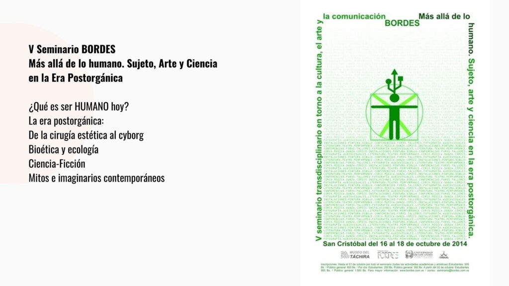 El tema de Más allá de lo humano. Sujeto, Arte y Ciencia en la Era Postorgánica, inspirado en trabajos de Paula Sibilia (Brasil) y Peter Sloterdijk (Alemania) y desarrollado por nuestro grupo de investigación BORDES, aborda el problema del humanismo en la contemporaneidad. En medio del temor generalizado por la destrucción del planeta; cuando las fantasías futuristas sobre la erradicación de las “debilidades” del cuerpo parecen tomar forma en las manipulaciones del genoma y surge la necesidad de desarrollar términos como “bioética”, acercando a las ciencias y humanidades en un proceso reflexivo que nos toca a todos.